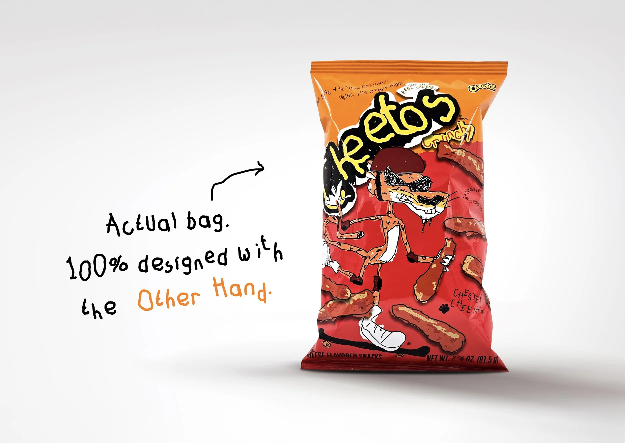 As part of the broader campaign, we designed a brand-new font—entirely with the non-dominant hand—and made it available for people to download and use. The font was then integrated on a limited-edition Cheetos bag that was entirely designed with the “other hand.”